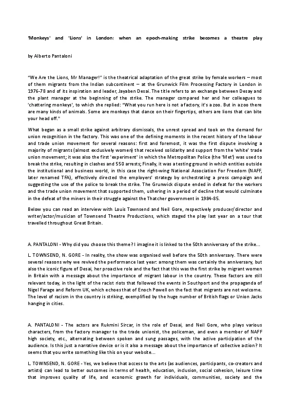 We Are the Lions, Mr Manager! è la trasposizione teatrale del grande sciopero delle operaie – la maggior parte migranti dal sub continente indiano - alla Grunwick Film Processing Factory di Londra nel 1976-78 e della sua ispiratrice e leader, Jayaben Desai. Il titolo riprende uno scambio fra Desay e il responsabile dello stabilimento all’inizio dello sciopero. Il manager paragonò lei e le sue colleghe a delle «scimmie chiacchierone», a che la risposta fu: «Quello che lei gestisce qui non è una fabbrica, è uno zoo. Ma in uno zoo ci sono molti tipi di animali. Alcuni sono scimmie che ballano sulla punta delle dita, altri sono leoni che possono staccarti la testa a morsi».
