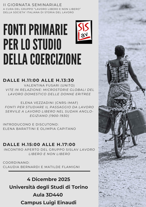 Il gruppo "Lavoro libero e non libero" della SISLav invia a partecipare alla II giornata seminariale di "Fonti e Posizionalità nella coercizione", che si terrà nell'Aula 3D440, Campus Luigi Einaudi, Università degli studi di Torino.