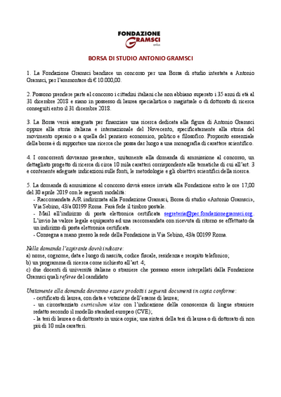 Bando: "Borsa di studio Antonio Gramsci" (deadline 30 aprile)