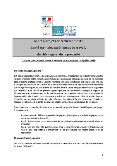DARES e DREES lanciano un appello per progetti di ricerca inerenti al tema "Santé mentale, expériences du travail, du chômage et de la précarité". La deadline per la presentazione delle proposte è fissata al 15 luglio 2019.