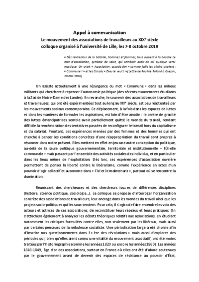 Nei giorni 7 e 8 ottobre 2019 si svolgerà, presso l'Università di Lille, il convegno internazionale dal titolo "Le mouvement des associations de travailleurs au XIXe siècle".