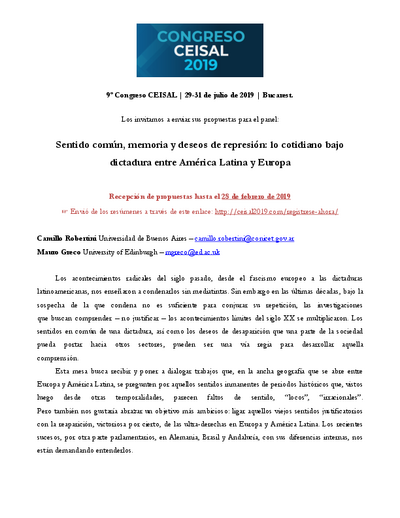 In occasione del nono Congreso Internacional CEISAL, che si svolgerà a Bucarest dal 29 al 31 luglio 2019, è stata diffusa da Mauro Greco e Camillo Robertini il call for paper per il panel dal titolo "Sentido común, memoria y deseos de represión: lo cotidiano bajo dictadura entre América Latina y Europa".