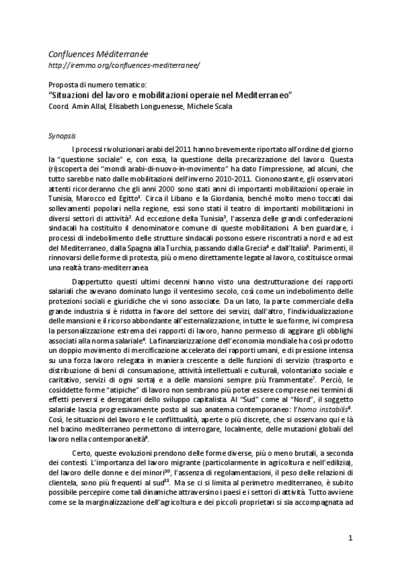 La rivista Confluences Méditerranée dedica un numero speciale ai temi del lavoro e delle mobilitazioni operaie nei paesi del perimetro mediterraneo. L'obiettivo è una riflessione a tutto campo sulle trasformazioni del lavoro e sulle resistenze che non mancano di accompagnare tali mutazioni, al fine di comprendere le articolazioni fra relazioni di dipendenza, di subordinazione e di loyalty, e forme di resistenza e di rivendicazione, che queste siano aperte o più discrete, durature o transitorie, improntate al cambiamento radicale o alla rinegoziazione dei ruoli di potere.