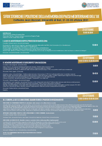 La Cattedra Jean Monnet Historical Challenges and Politics of Memory of European Integration. South Italy and the Mediterranean Area, tenuta dal prof. Carlo Spagnolo presso l'Università degli Studi di Bari "Aldo Moro", organizza la conferenza "Sfide storiche e politiche della memoria dei paesi mediterranei dell’UE".