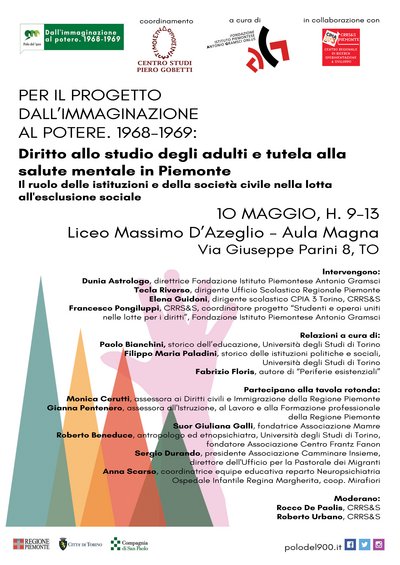 All’interno del progetto “Dall’immaginazione al potere. 1968-1969” - coordinato dal Centro studi Piero Gobetti per il Polo del ‘900, la Fondazione Istituto Piemontese Antonio Gramsci, il Centro Regionale di Ricerca, Sperimentazione e Sviluppo (CRRS&S) della Regione Piemonte e la rete dei Centri per l'Istruzione degli adulti (Rete CPIA Piemonte) organizzano un convegno e una tavola rotonda dal titolo “Diritto allo studio degli adulti e tutela alla salute mentale in Piemonte: il ruolo delle istituzioni e della società civile nella lotta all'esclusione sociale”.