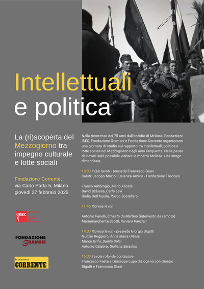 Nella ricorrenza dei 75 anni dall’eccidio di Melissa, Fondazione ISEC, Fondazione Gramsci e Fondazione Corrente organizzano una giornata di studio sul rapporto tra intellettuali, politica e lotte sociali nel Mezzogiorno negli anni Cinquanta.