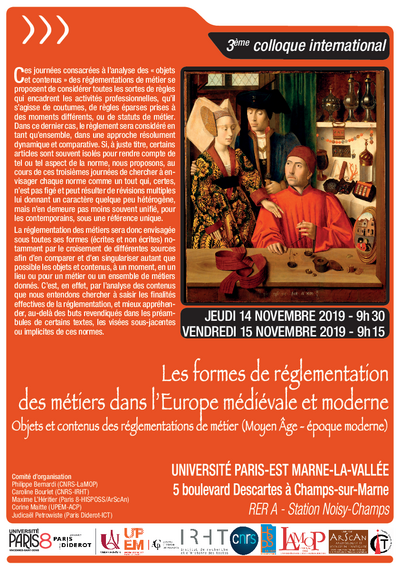 Si terrà nei giorni 14 e 15 novembre 2019 la terza edizione del convegno internazionale "Les formes de réglementation des métiers dans l’Europe médiévale et moderne" sul tema "Objets et contenus des réglementations de métier" presso l'Università Paris-Est Marne-la-Vallée.