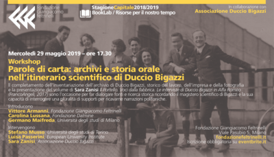Il completamento dell’inventariazione dell’archivio di Duccio Bigazzi, storico del lavoro, dell’impresa e della fotografia, e la pubblicazione del volume di Sara Zanisi, Il Portello. Voci dalla fabbrica. Le interviste di Duccio Bigazzi in Alfa Romeo (FrancoAngeli, 2017) sono l’occasione per far dialogare fonti e ricerca storica ricordando il magistero scientifico di Bigazzi e la sua capacità di interrogare una pluralità di supporti per ricavarne narrazioni polifoniche.