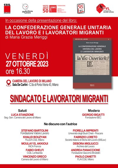 27 ottobre 2023: presentazione di M. G. Meriggi, La Confederazione generale unitaria del lavoro e i lavoratori immigrati