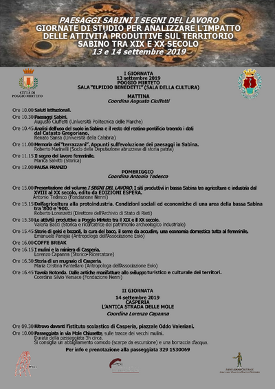I lavori si concluderanno con una passeggiata a Casperia (RI) in via delle Molette sulle tracce dei mulini presi in esame nel volume.