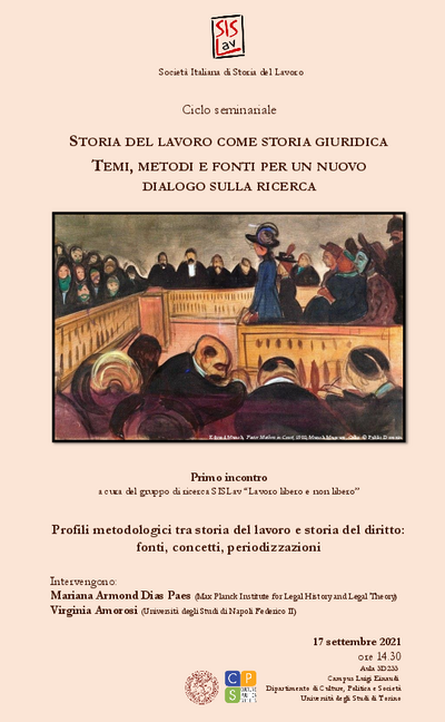 Il seminario tratterà della storia del lavoro come storia giuridica e analizzerà fonti, concetti e periodizzazioni nella metodologia di ricerca, spaziondo tra la storia del lavoro e la storia del diritto. L'incontro, il primo di una serie, si terrà il 17 settembre 2021 alle ore 14.30 presso l'aula 3D233 del Dipartimento di Culture, Politica e Società del campus Luigi Einaudi dell'università degli Studi di Torino.