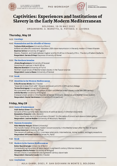 Workshop "Captivities. Experiences and Institutions of Slavery in the Early Modern Mediterranean" (Bologna, 18 - 19 maggio 2023)