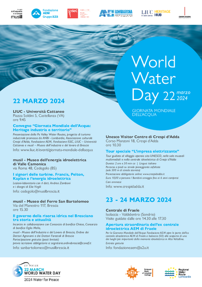 Il 22 marzo si celebra la Giornata mondiale dell'acqua, istituita dalle Nazioni Unite nel 1992. Fondazione ISEC partecipa alla ricorrenza insieme alla rete della Regional Water Route creata nell'ambito dell'iniziativa europea European Route of Industrial Heritage, nata nel 1999 dallo stimolo del Consiglio d’Europa che invitava gli Stati membri a presentare progetti relativi alla comune identità culturale del Continente.